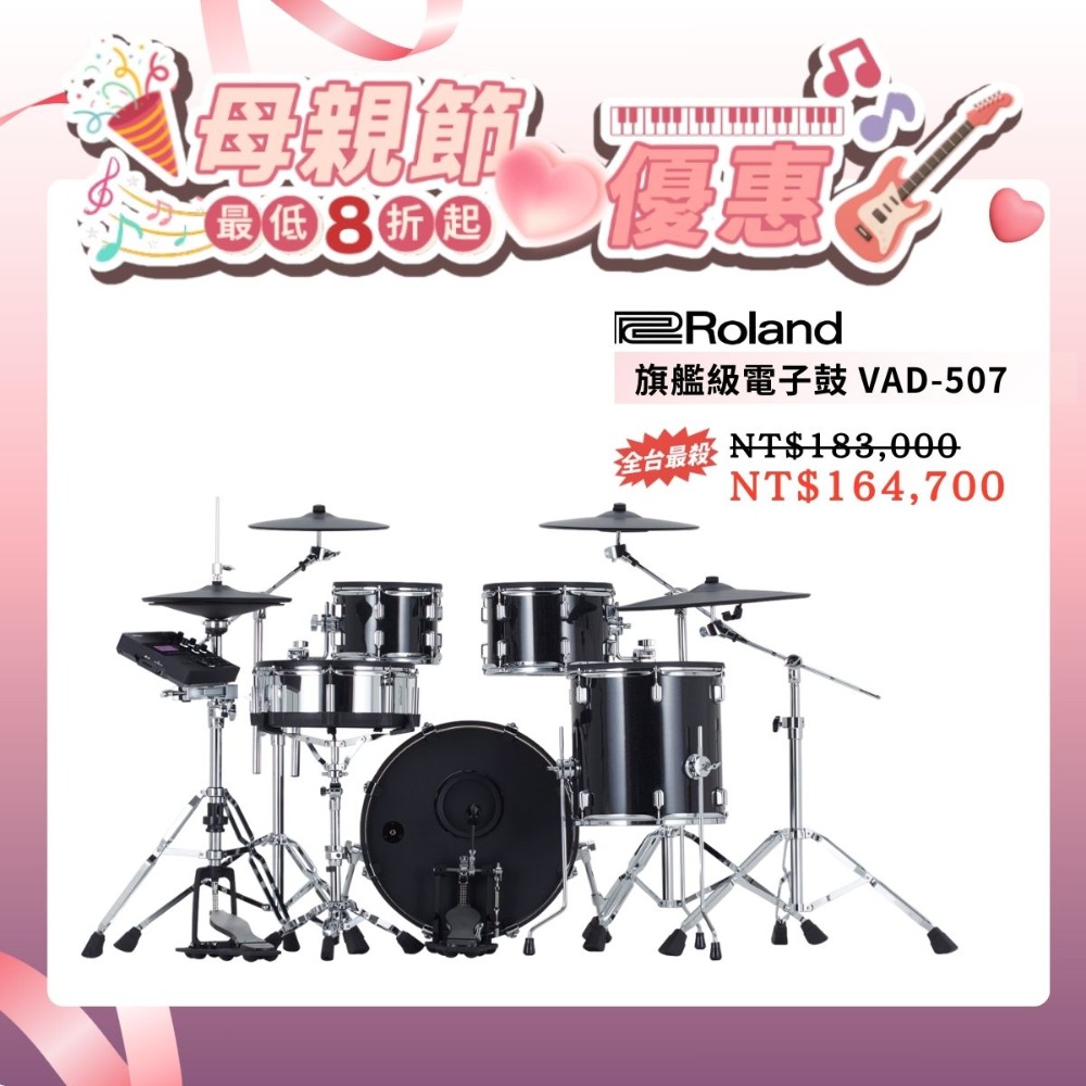 - 五件式 V-Drums Acoustic Design 套鼓,具有全尺寸木製鼓殼和升級的雙支架鉻鼓架