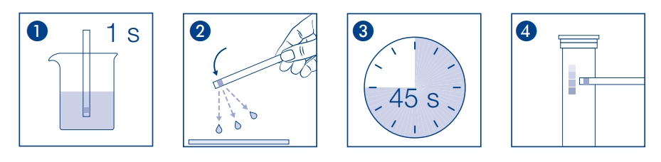 - 將試紙條(包含所有測試塊)全部浸入到樣本溶液中(pH2-9之間)約一秒鐘的時間,隨即取出。