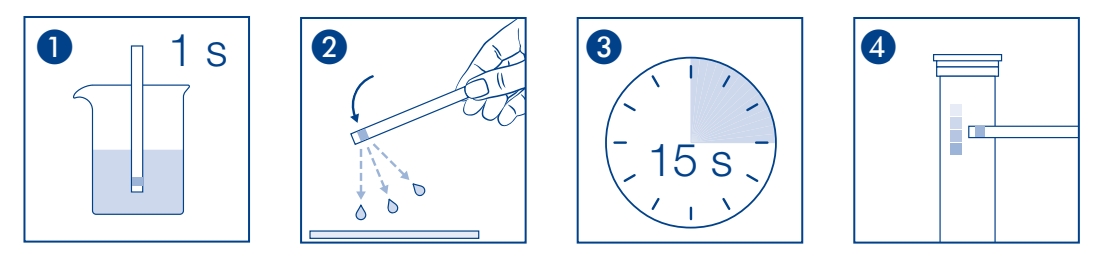 - 取出所需的測試條數量,將試紙浸泡於溶液中(溶液pH值4-6之間),時間約1秒。