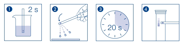 - 取出所需的測試條數量,將試紙浸泡於溶液中(溶液pH值2-9之間),時間約2秒。