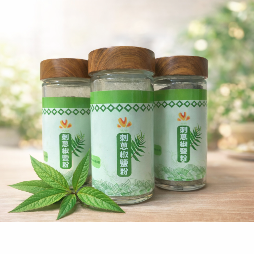 刺蔥是原住民部落很常見的香氣食材,它嫩葉片具有強烈的香氣,帶著些許青蔥加上山椒的氣味,顏色近似抹茶。將新鮮刺蔥葉乾燥磨粉後,搭配簡單調味,讓食物多了一份清香但是並不搶味,也可去除腥味。